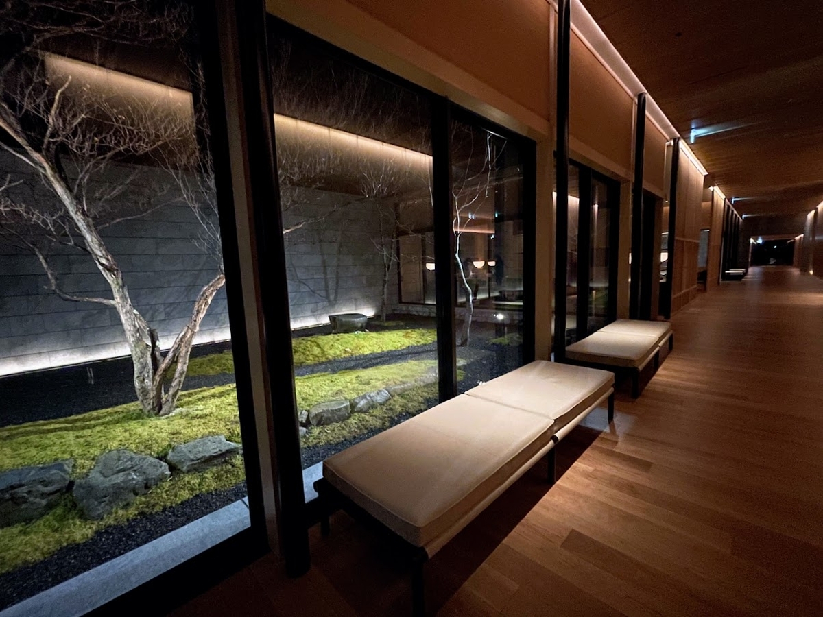 温泉棟に入ると、まるで神殿の回廊のような洗練されたアプローチにワクワクしました。