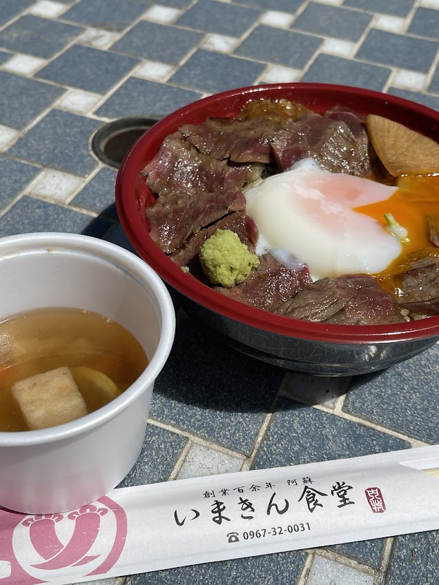 11時半 あか牛丼をいただきました。柔らかい赤身肉と優しい味わいが絶品で、行列ができるのも納得の美味しさです。阿蘇を訪れる際には、また「いまきん食堂」に立ち寄りたいです。