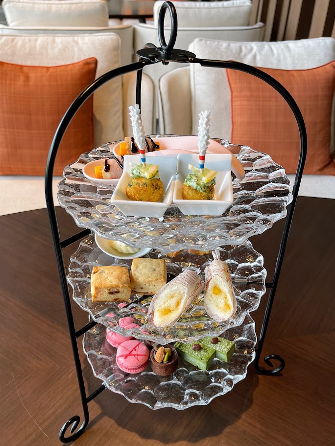 アフタヌーンティーは、3段のケーキスタンドに美しく盛り付けられていました。一般的には、塩気のあるセイボリーが盛り付けられた下の段のお皿から順番にいただくのが一般的なマナーです。しかし、こちらのアフタヌーンティーでは、ティースタンドの上段にセイボリーが配置されており、上の段から順番にいただくスタイルでした。