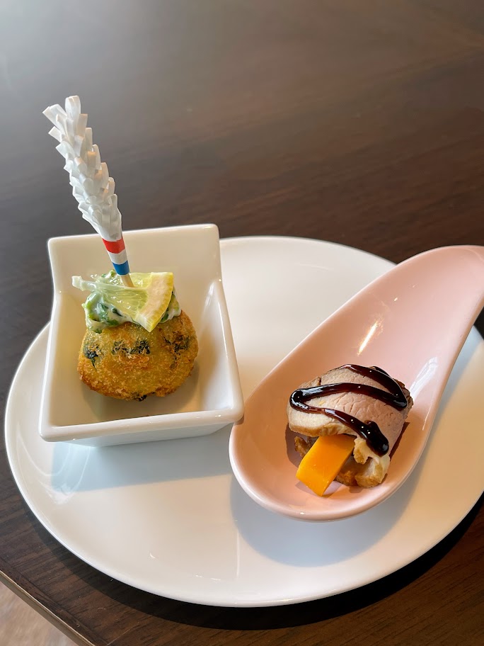 海老のマリネや八幡平のマッシュルームはとても美味しかったです。ただ、ディナー前の軽食として提供される料理のボリュームは、私がこれまで経験したクラブラウンジのカクテルタイムと比べると少なめに感じました。