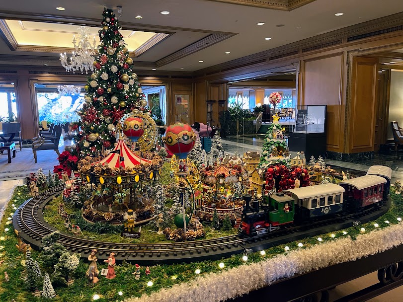 ホテル棟のロビーの『煌めくおもちゃの街』には、サンタクロースが乗った列車が走っていました。