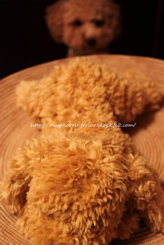 どうも似ていて…買ってしまいました。(本人見過ぎ) 上から見ると、「目が見えない感じ」、「くたっとした感じ」、 似てるので、気に入ってくれるかと思いまして… でもウチにはじめて迎えた日に、 あげたテディベアが今でも一番お気に入り。 針と糸で補修し…